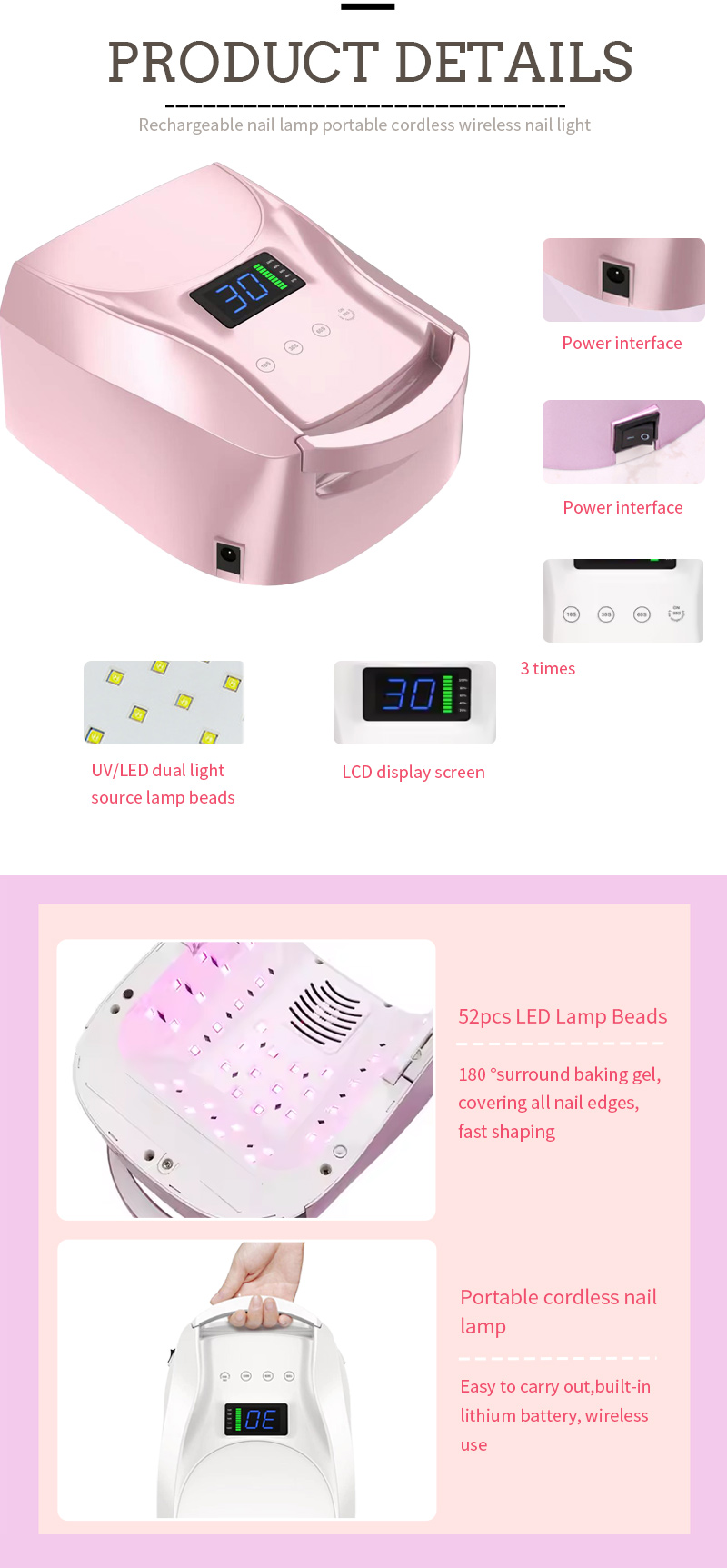 لامپ لامپ لامپ ناخن قابل شارژ نسخه حرفه ای 96W ظاهر محصول دارای طراحی شیار است ، دسته از شیار را می توان به عنوان یک نقش دسته قابل حمل استفاده کرد و حمل و قرار دادن آن راحت تر می شود. همچنین از ضرر این دسته که به راحتی شکسته می شود و شل می شود ، جلوگیری می کند.
