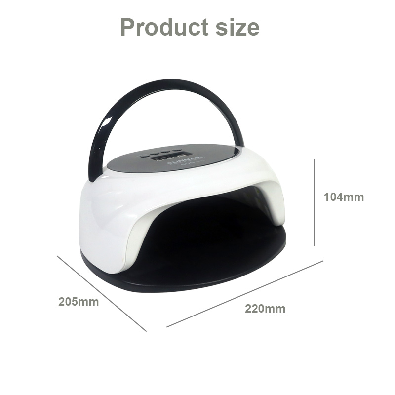 ابعاد لامپ خشک کن ناخن با عملکرد سنسور اتوماتیک 205 میلی متر طول، 220 میلی متر عرض و 104 میلی متر ارتفاع، با ظرفیت زیاد و قابلیت استفاده از دو دست و پا که بسیار راحت است.