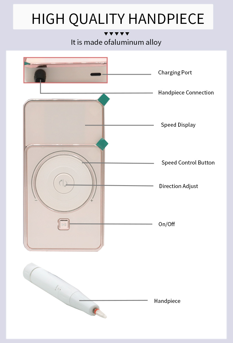این طراحی صفحه نمایش قلم سنگ زنی کم سر و صدای پر سرعت، با سوکت قلم سنباده، نمایشگر کریستال مایع LCD، می تواند تعداد دور/قدرت/جهت، دکمه سوئیچ سرعت، دکمه جابجایی در جهت عقربه های ساعت/ خلاف جهت عقربه های ساعت، دکمه مکث، موتور حرفه ای 30000 دور در دقیقه، سر سنگ زنی قفل پیچی را نشان دهد.